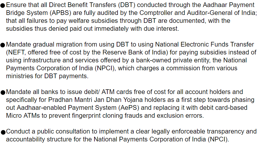 1. A thorough #CAG audit on #DBT infra to officially document the reasons for exclusions (untraceable payments referred in #NITIAayog Poshan report) and detailed report on #APB, compensate the beneficiaries who are denied welfare benefits with interest