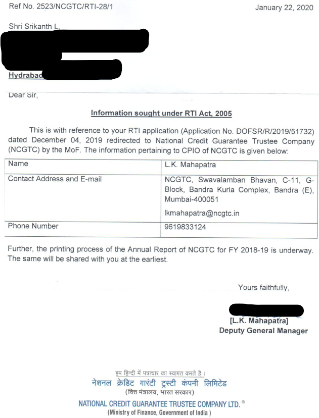 #CashlessConsumer #RTI We asked Finance Ministry details of CPIO of NCGTC and status of Annual Report of FY 2018-19. NCGTC PIO responce attached
