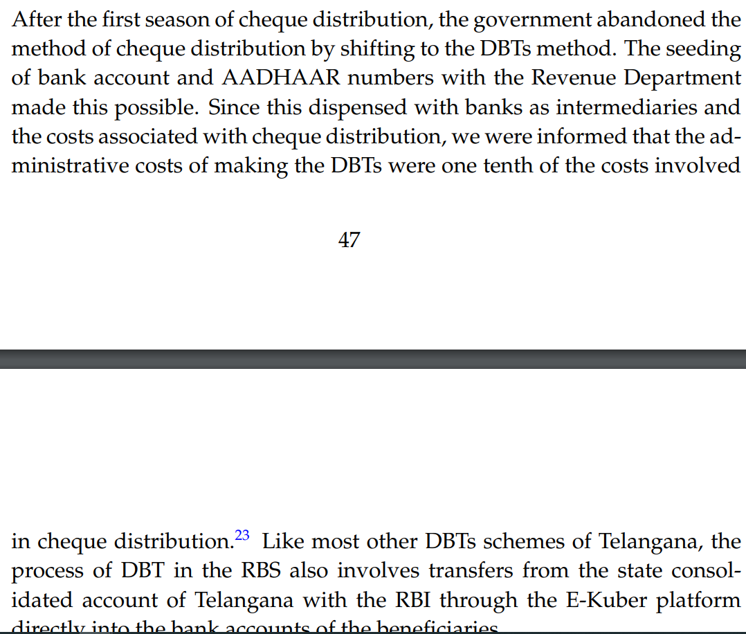 #CashlessConsumer This paper studies the agriculture income support scheme Rythu Bandhu implemented in #Telangana in detail. It has a interesting note on payments. #Thread on #G2PPayments #DBT