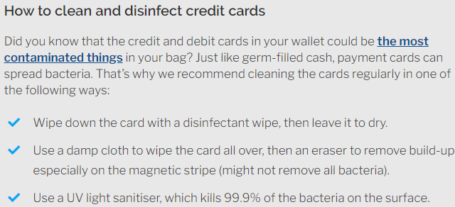 Steps to clean your card -- Don't believe in propoganda that says avoid cash, use cards. Because they are equally susceptible to carry germs.