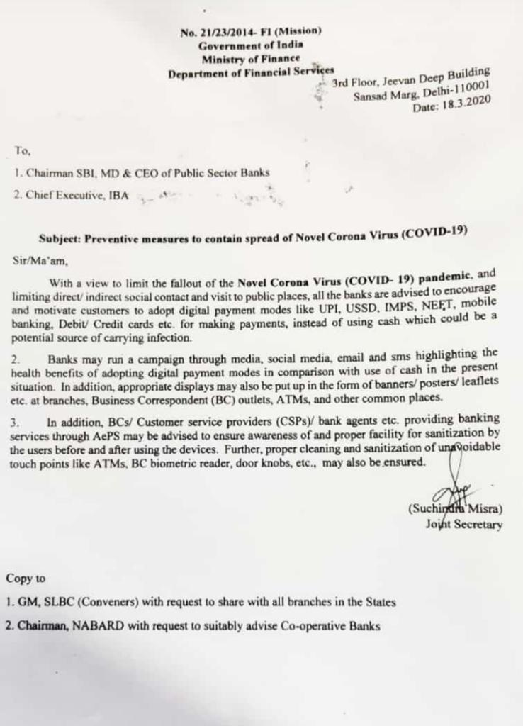 #COVID19 Dept Financial Services, GoI #India letter to SBI / IBA to promote #DigitalPayments and also instructs banks to ensure sanitization awareness for #AePS BCs including biometric readers.