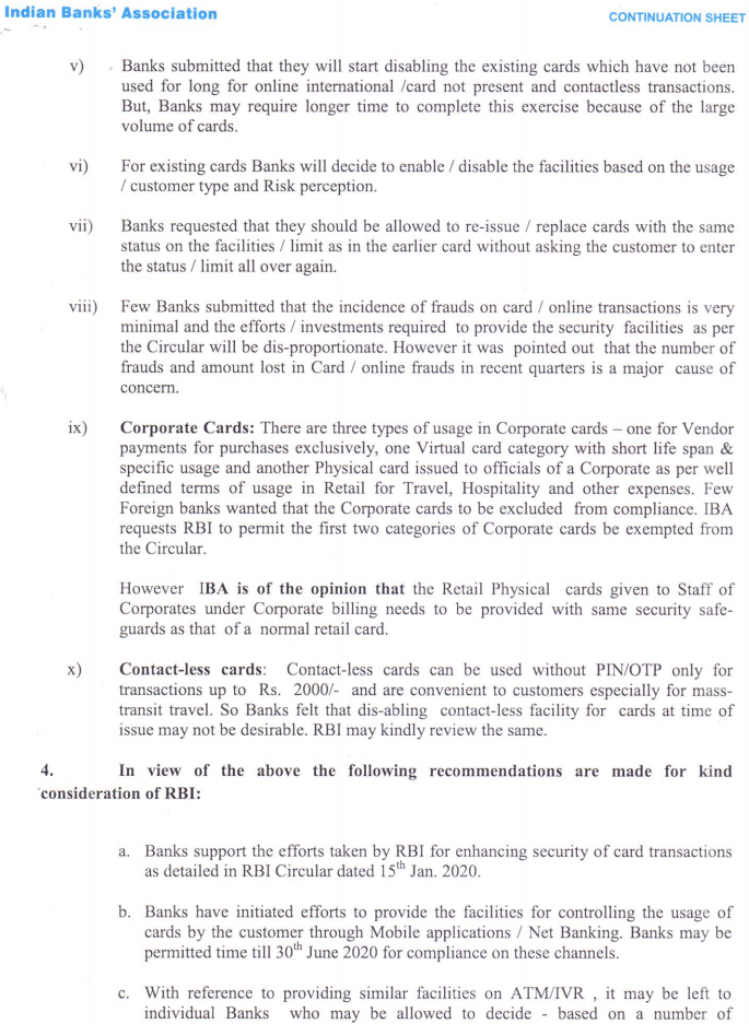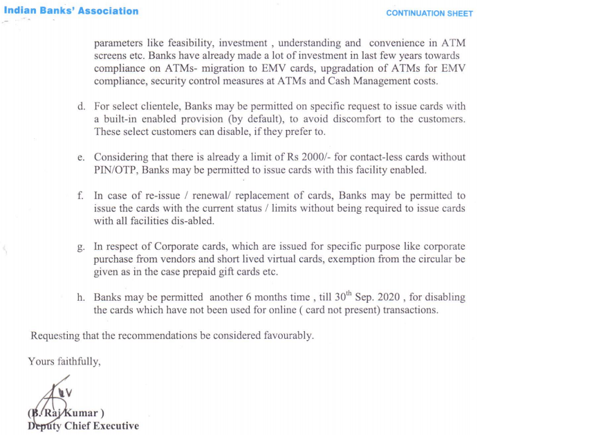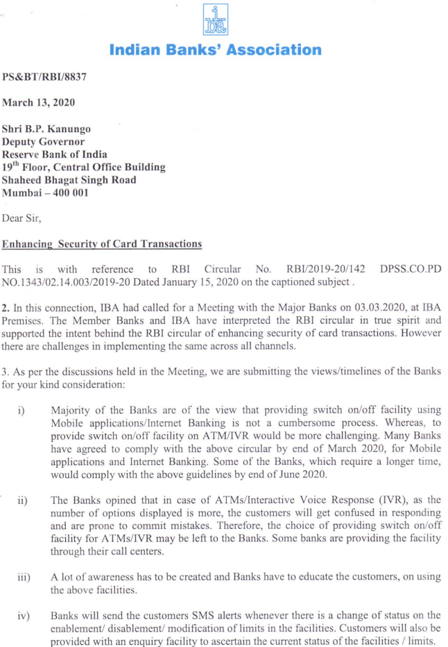 #CashlessConsumer IBA letter to RBI on Mar 13 has sought relaxation / extension on enforcement of placing limits and enabling / disabling card not present (online) / contactless transaction on cards. #DigitalPayments #Security