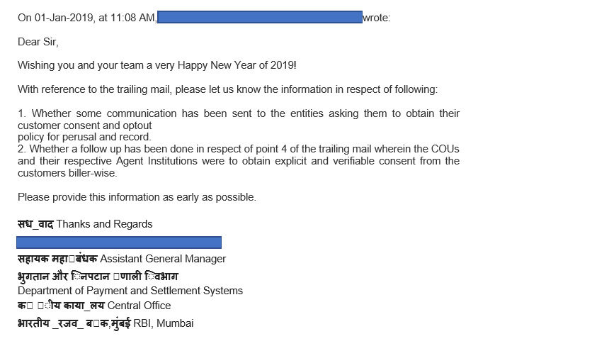 The violations meanwhile keep continuing. The followup to the complaint in Oct 2018 was made last month - https://medium.com/cashlessconsumer/following-up-on-consent-less-auto-fetch-privacy-violations-in-bbps-500ecc27fa30 #CashlessConsumer #Privacy #CreditScoring #DataEconomy
